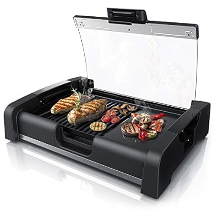 Arendo – Gourmet Tischgrill Elektrogrill – 1650 W – mit Glasabdeckung – für Balkon Garten Indoor – Antihaftbeschichtung – Temperaturregelung mit 5 Stufen – GS-zertifiziert
