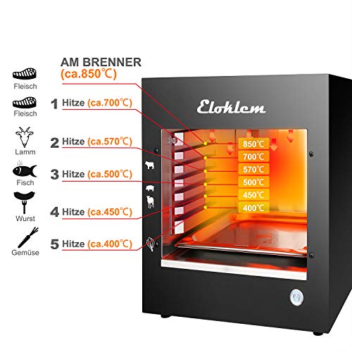 Breites Anwendungsspektrum: Unser Steakgriller ist flexibel durch 7 Einschubhöhen und differenzierten Temperaturen 380° bis 850°, IDEAL für Steaks, Lammfleisch, Burger-Patties, Fisch, Wurst, Pizza, Meeresfrüchte, Gemüse usw. verwendet werden.