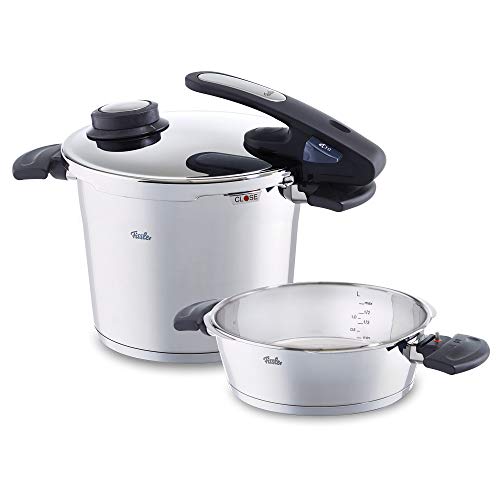 Einzigartiges Design, verbunden mit ultimativer Funktionalität dafür steht dieses Schnellkochtopf Set. Mit dem praktischen Dämpf einsatz und der drucklosen Dampfgarstufe ersetzt der Schnellkochtopf sogar einen separaten Dampfgarer.Vitavit edition premium Stilvoll Kochen mit höchster Qualität.Das Wichtigste auf einen Blick: Ein Schnellkochtopf mit zwei Garstufen plus Dampfgarfunktion und eine Schnellbratpfanne. Spülmaschinengeeignet: Topf und Deckel (ohne Dichtungsring, Kochventil-Einheit und Deckelstiel) können in die Spülmaschine. Kunststoffgriff Mit: Aufsetzhilfe, Verriegelungsanzeige, Kochanzeige mit Ampelfunktion, abnehmbarem Griff, einstellbareKochstufen, einstellbare Abdampffunktion, drucklose Dampfgarstufe und Innenskalierung.Geeignet für alle Herdarten, einschließlich Induktion Topfkörper: Edelstahl Deckel: Metalldeckel mit Ventil .Unsere Firma steht seit Jahrzehnten für qualitativ hochwertiges Kochgeschirr, das sich durch präzise Verarbeitung, hohen Gebrauchsnutzen und stilvolles, durchdachtes Design auszeichnet. Die Produkte passen sich stets individuellen Bedürfnissen in Funktion und Design an und entsprechen dadurch den unterschiedlichen Wünschen um die Arbeit in der Küche zu erleichtern und die Freude am Kochen zu steigern.