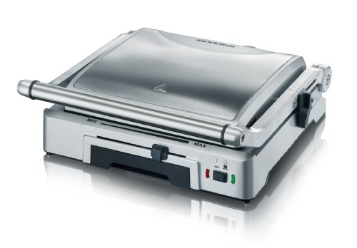 Platzsparender und kompakter Kontaktgrill zum Grillen von Fisch, Fleisch und Gemüse, Toasten von Paninis und Überbacken von Speisen – Inklusive auswechselbarer und glatter Zusatzplatte – Schmackhaftes Zubereiten mit glattem und typischem Grillmuster: Fettfreies und gesundes Grillen dank antihaftbeschichteter Platten, Gleichmäßige Bräunung auf beiden Seiten durch aufklappbaren Deckel mit Grillplatte – Arretiereinrichtung mit wärmeisoliertem Griff zum Überbacken, Mit praktischem Temperaturregler und Kontrollleuchte, Inklusive integrierter Fettauffangschale, Leistungsstark: ca. 1.800 W, Hochhitzebeständige Lackierung, Große Grillfläche (LxB: 27 x 24 cm), Leichte Reinigung mit feuchtem Tuch – Lieferumfang: 1 SEVERIN Kontaktgrill, KG 2392, Material: Edelstahl/Kunststoff, Maße (LxBxH): 36 x 36 x 14 cm, Gewicht: 5,683 kg, Leistung: 1.800 W, Farbe: Edelstahl/Silber