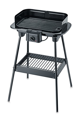 Typisches Grillmuster durch antihaftbeschichtete Gussplatte mit einer großen Fläche von L:38 x B:22,4 cm, Geringe Rauch- und Geruchsentwicklung bei wassergefüllter Grillwanne, Auch nutzbar als Tischgrill durch Entfernen des Standuntergestells