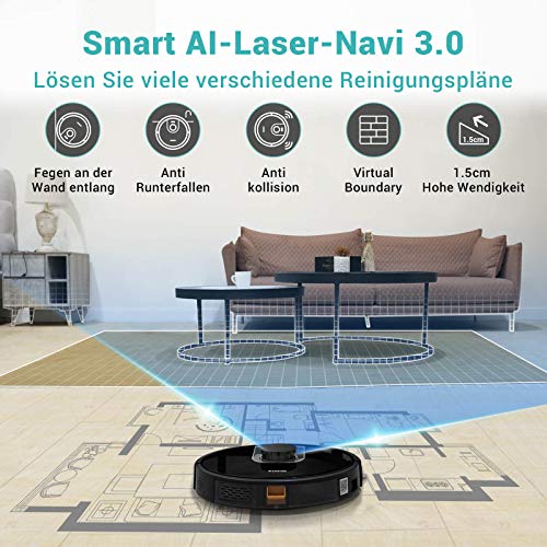【AI-Laser-Navi 3.0-Technik】 Saugroboter Spark-980 scannt jeden Bereich Ihres Raums, erstellt eine virtuelle Karte und startet dann eine geplante Reinigung.Bei schwacher Akkuladung lädt er sich selbst auf und setzt die Reinigung dort fort, wo er sie unterbrochen hat, sich von fehlendem Scannen und wiederholtem Scannen verabschieden. Die Lasertechnologie kann auch Hindernisse und verbotene Bereiche genau identifizieren.