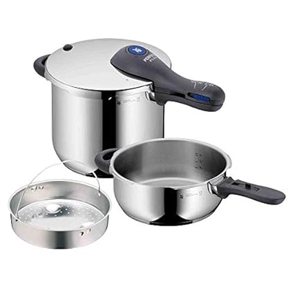 WMF Perfect Plus Schnellkochtopf Set Induktion 3-teilig, Dampfkochtopf 6,5l + 3l mit Einsatz-Set, Cromargan Edelstahl poliert, 2 Kochstufen