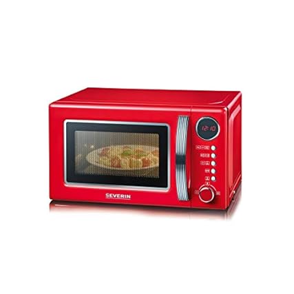 SEVERIN 2-in-1 Retro Mikrowelle mit Grillfunktion, Grillofen mit 5 Leistungsstufen und 8 Automatikprogrammen, hochwertige Mikrowelle mit Grill, ca. 700 W, rot / chrom, MW 7893